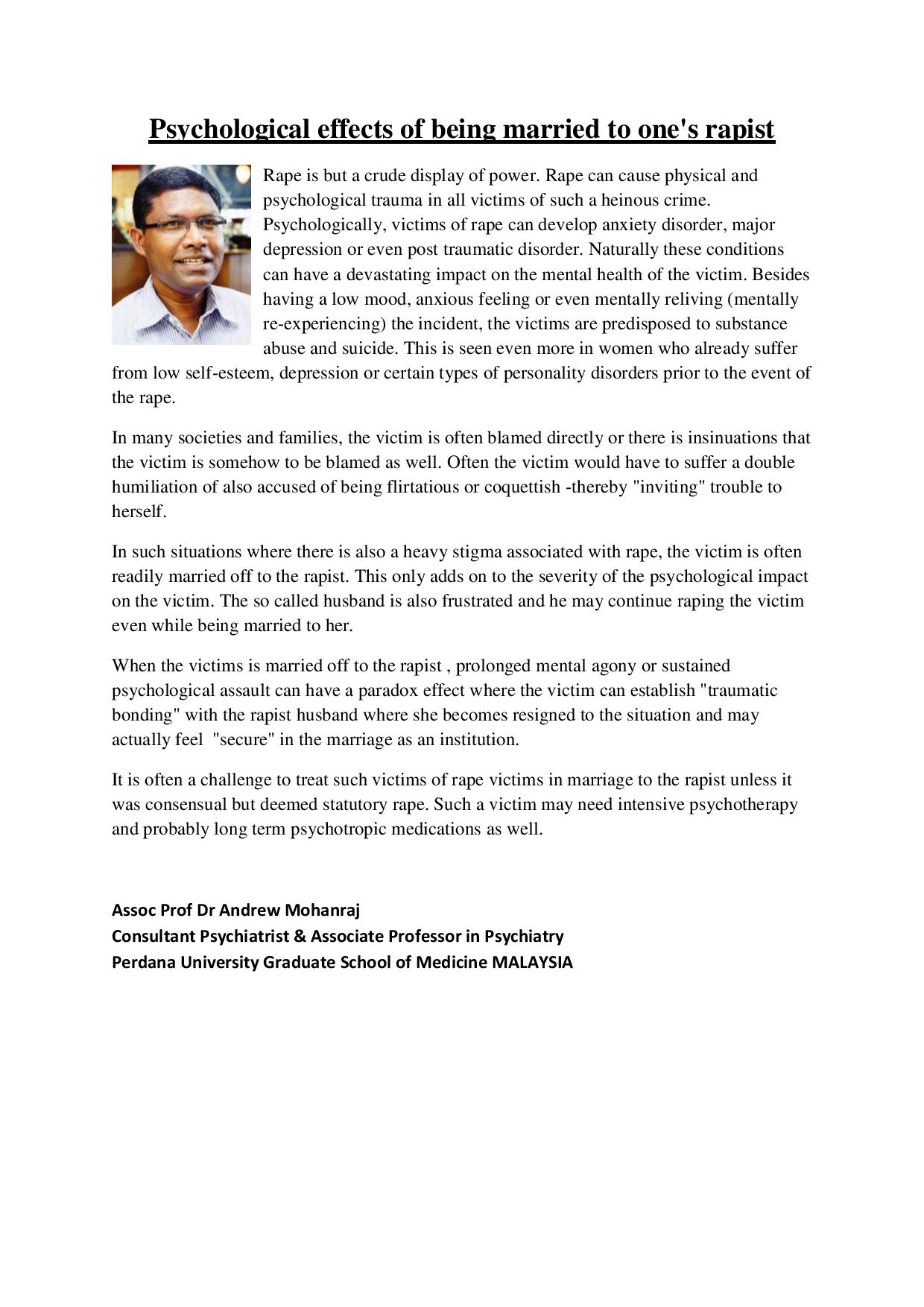 The Psychological Effects of Being Married to One’s Rapist Posted on July 21, 2015August 2, 2015 by andrewmohanraj Share this: Click to share on X (Opens in new window) X Click to share on Facebook (Opens in new window) Facebook Click to print (Opens in new window) Print Click to email a link to a friend (Opens in new window) Email Click to share on WhatsApp (Opens in new window) WhatsApp Like Loading...