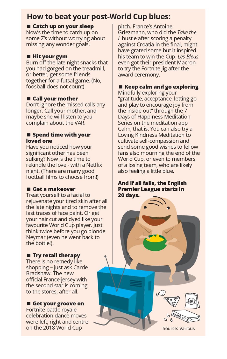 Just like handling grief, people can overcome this by reminiscing the excitement and talking about the particular features of the matches to find strength in each other, he advises. “Like grief, slowly the focus will move on to another game or another sport and before you know it, there will be another World Cup to look forward to.”